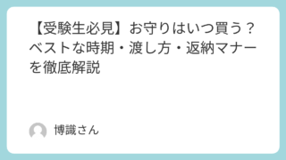 知識 【受験生必見】お守りはいつ買う?ベストな時期・渡し方・返納マナーを徹底解説 「受験のお守りって、いつ買うのが正解?」と迷っていませんか。実は、お守りを買う時期に絶対のルールはありませんが、タイミングや渡し方には心を伝えるコツがあります。この記事では、受験のお守りはいつ買う?という疑問に答えながら、購入のベストタイミ... 知識