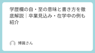 社会 学歴欄の自・至の意味と書き方を徹底解説|卒業見込み・在学中の例も紹介 履歴書の学歴欄にある「自」「至」という文字、意味や書き方が分からず戸惑ったことはありませんか。実はこの2つの漢字は、入学や卒業といった“いつからいつまで”の期間を示すための正式な表記です。「自」は入学や入社などのスタート時期、「至」は卒業や... 社会