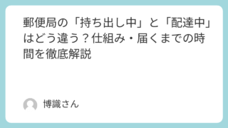 知識 郵便局の「持ち出し中」と「配達中」はどう違う?仕組み・届くまでの時間を徹底解説 郵便局の追跡画面で「持ち出し中」と表示されると、「あとどれくらいで届くんだろう?」と気になりますよね。実は「持ち出し中」と「配達中」はほぼ同じ意味で、どちらも荷物が配達員の手に渡り、あなたの家に向かっている状態を示しています。ただし、郵便局... 知識