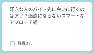 おつきあい 好きな人のバイト先に会いに行くのはアリ?迷惑にならないスマートなアプローチ術 「好きな人に会いたい」「バイトしている姿を見てみたい」──そんな気持ち、誰でも一度は抱いたことがありますよね。でも実際に会いに行こうとすると、「迷惑かな?」「引かれたらどうしよう」と不安になる人も多いはずです。この記事では、好きな人のバイト... おつきあい