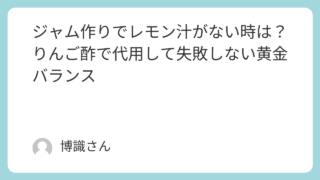 料理 ジャム作りでレモン汁がない時は?りんご酢で代用して失敗しない黄金バランス 「ジャムを作ろうと思ったのに、レモン汁が切れていた…」そんな経験はありませんか。実はレモン汁がなくても、りんご酢・クエン酸・柑橘果汁・りんごの芯や皮を使えば、ちゃんとおいしいジャムを作ることができます。この記事では、なぜ酸が必要なのかという... 料理