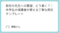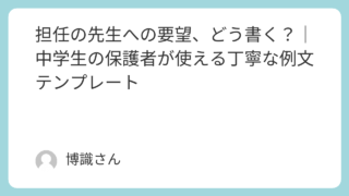 生活 担任の先生への要望、どう書く?|中学生の保護者が使える丁寧な例文テンプレート 「担任の先生に、どうやって要望を伝えたらいいの?」──そう悩む保護者の方は少なくありません。中学生になると、勉強・友人関係・生活リズムなど、家庭から先生に伝えたいことも増えてきます。けれど、言い方ひとつで「クレーム」と受け取られてしまうこと... 生活