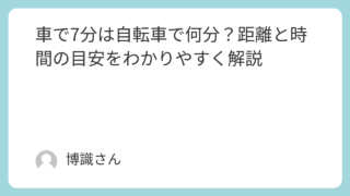 知識 車で7分は自転車で何分?距離と時間の目安をわかりやすく解説 車で7分くらいの距離だけど、自転車だと何分くらいなのでしょうか。通勤や買い物、子どもの送り迎えなど、日常の移動では距離感を正しくつかむことがとても大切です。この記事では、車で7分の距離が何キロなのかを計算し、自転車や徒歩ではどのくらい時間が... 知識