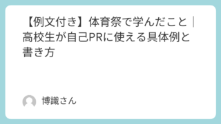 社会 【例文付き】体育祭で学んだこと|高校生が自己PRに使える具体例と書き方 「体育祭で学んだことは何ですか」と聞かれたとき、あなたは自信を持って答えられますか。高校生にとって体育祭は大きな思い出ですが、その経験は受験や面接で評価される大切なエピソードにもなります。本記事では、体育祭で学んだことを具体例とともに整理し... 社会