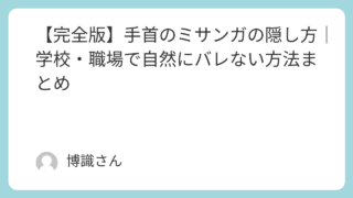 生活 【完全版】手首のミサンガの隠し方|学校・職場で自然にバレない方法まとめ 手首につけたミサンガを外したくないけれど、学校や職場のルールが気になる。そんな悩みを抱えていませんか。この記事では、ミサンガを自然に隠す具体的な方法から、場面別の対処法、さらに後悔しない選択の考え方までをわかりやすく解説します。校則や社内規... 生活