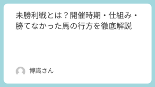 知識 未勝利戦とは?開催時期・仕組み・勝てなかった馬の行方を徹底解説 競馬を観ていると耳にする「未勝利戦」という言葉。なんとなく「まだ勝っていない馬のレース」とはわかっていても、詳しい仕組みや開催時期、そして勝てなかった馬の行方までは意外と知られていません。この記事では、未勝利戦の基本的なルールから、2歳・3... 知識