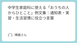 生活 中学生家庭科に使える「おうちの人からひとこと」例文集|通知表・実習・生活習慣に役立つ言葉 中学生になると、家庭科の授業や通知表などで「おうちの人からひとこと」を書く機会が増えてきます。しかし、いざ記入しようとすると「どんな言葉を書けばいいのか分からない」と悩む保護者の方も多いのではないでしょうか。この記事では、中学生の家庭科でよ... 生活