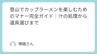 生活 登山でカップラーメンを楽しむためのマナー完全ガイド|汁の処理から道具選びまで 登山の楽しみのひとつといえば、山頂で食べるカップラーメンですよね。ただし、その一杯を安心して味わうためにはマナーや道具の準備が欠かせません。特に、食べ終わった後の汁の処理は登山マナーの最重要ポイントです。自然に捨ててしまうと環境を汚すだけで... 生活