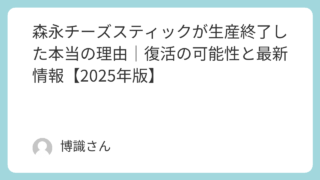 知識 森永チーズスティックが生産終了した本当の理由|復活の可能性と最新情報【2025年版】 「森永チーズスティックが生産終了って本当?」——そんな疑問を持つ人が今も少なくありません。冬の定番アイスとして人気を誇った森永チーズスティックは、チーズケーキのような濃厚さと手軽さで多くのファンを魅了しました。しかし、2024年に突如終売が... 知識