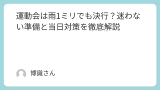 知識 運動会は雨1ミリでも決行?迷わない準備と当日対策を徹底解説 天気予報で「降水量1ミリ」と出ると、「運動会ってあるの?」と不安になりますよね。小雨程度の雨でも、当日の判断や準備が大きく変わるのが学校行事の難しいところ。この記事では、「雨一ミリのとき運動会は開催されるのか?」という疑問に対して、実際の判... 知識