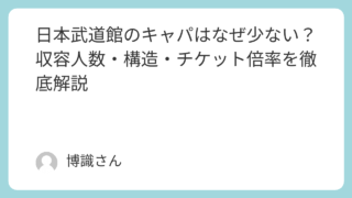 知識 日本武道館のキャパはなぜ少ない?収容人数・構造・チケット倍率を徹底解説 「日本武道館のライブって、チケットが全然取れない…」「あんなに有名なのにキャパが少ないの?」と思ったことはありませんか。実際、日本武道館は最大収容人数が約14,471人とされているものの、ライブ開催時にはステージ構成や機材の関係で、実質的に... 知識