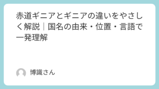 知識 赤道ギニアとギニアの違いをやさしく解説|国名の由来・位置・言語で一発理解 「ギニア」と「赤道ギニア」、名前はそっくりでも実はまったく別の国です。さらに「ギニアビサウ」や「パプアニューギニア」まで出てくると、頭の中がこんがらがってしまいますよね。この記事では、4つの「ギニア」の国を地理・言語・歴史の視点から分かりや... 知識